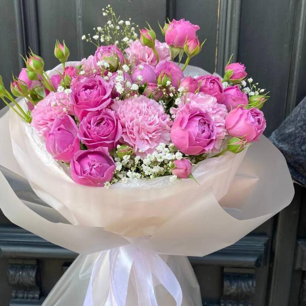 Пионовидные розы Мисти Баблс, диантус розовый и гипсофила в Лянторе